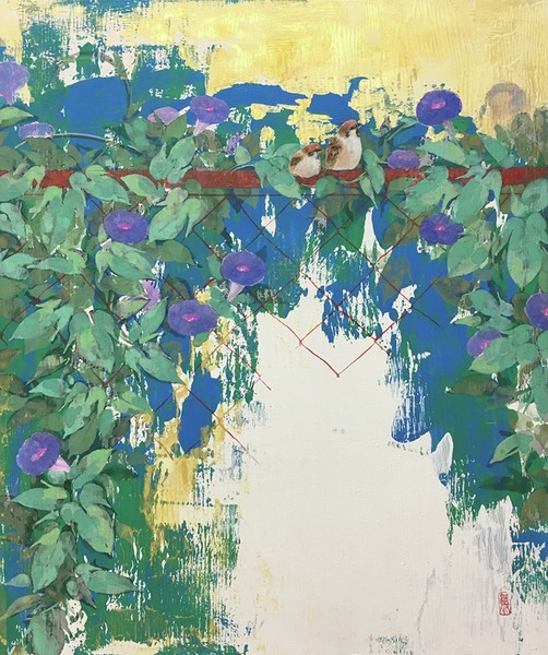 朝顔と雀。 アナログで描いた日本画作品をデジタル化しています。 実際の作品サイズ:F20 制作年:2018