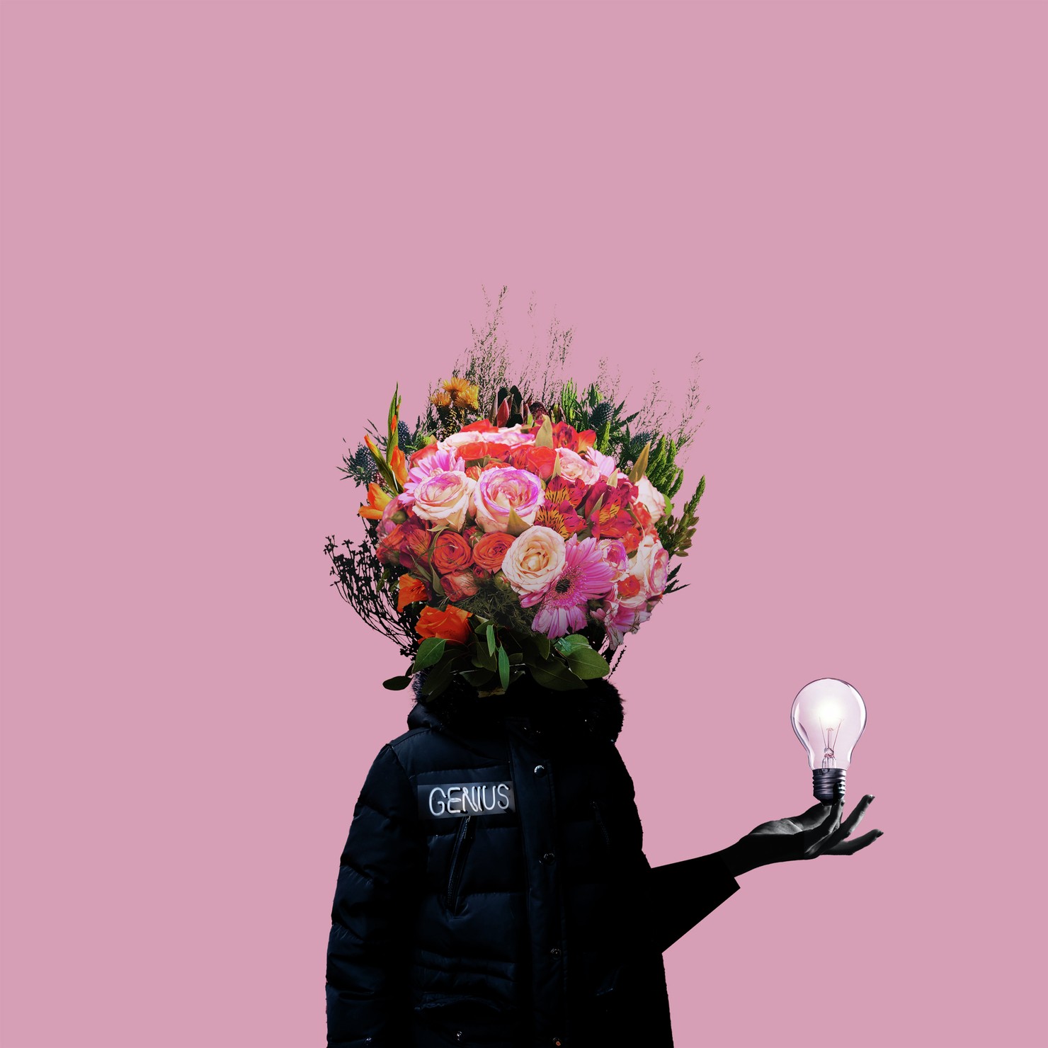 複数枚の写真を切り貼りしコラージュすることでキャラクターを生成したフォトコラージュ作品。生成したキャラクターは「Crypto Flower Head」といい、胸に表された記号や文字と、手に持つアイテムによって意味やストーリーを表現したNFTです。 ================================ シュールで可愛い、少し悪戯でダークなキャラクター 開花した頭(Crypto Flower Head)にはあらゆる想像がいっぱい。 「閃きの電球」を手にしたCrypto Flower Head ダウンジャケットの右胸には天才を意味する「GENIUS」の文字 Image size:W2500px_H2500px|JPG Edition:1 / 1