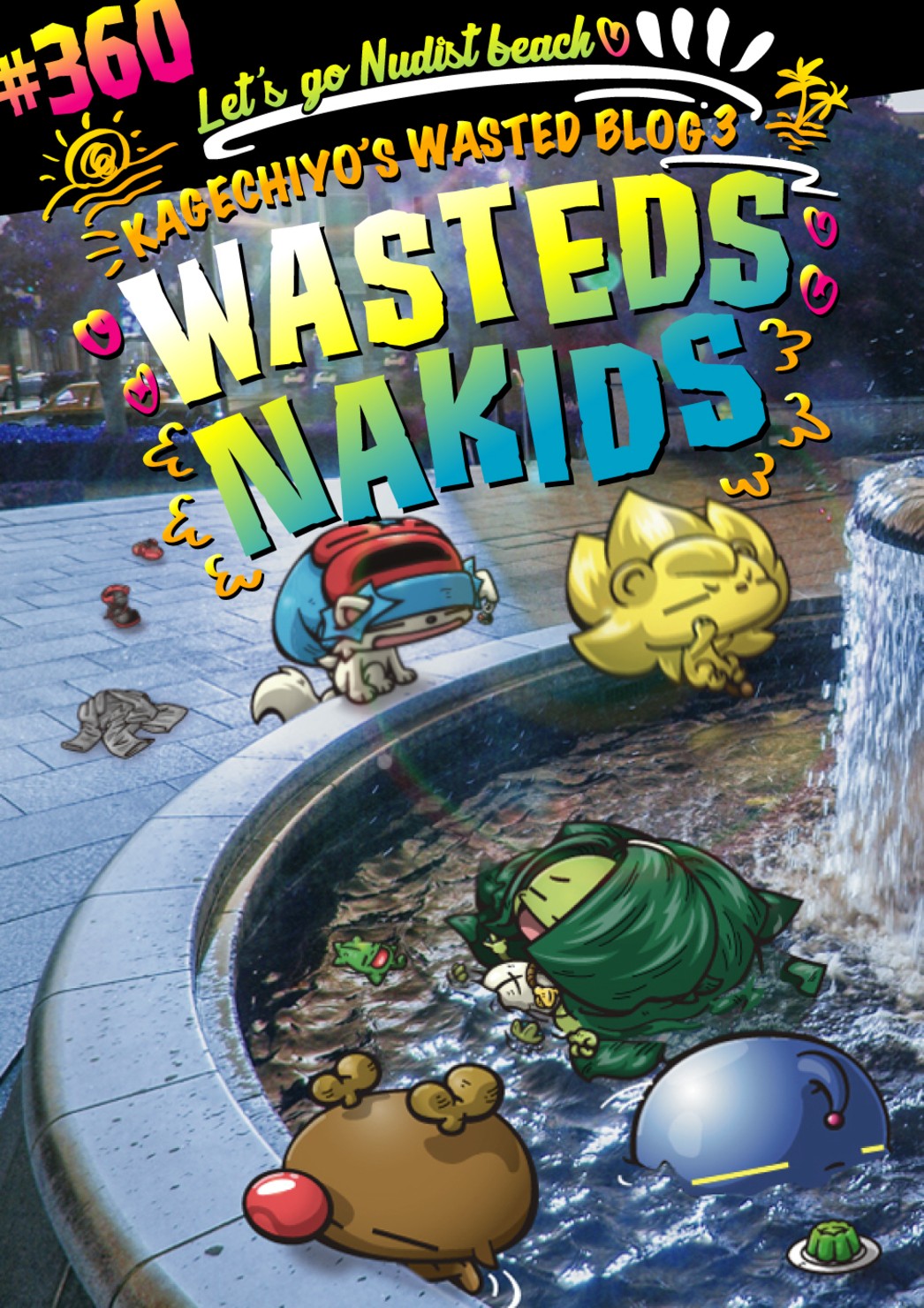 ブログにて連載中のマンガ 『KAGECHIYO'S WASTED BLOG3』の第360話 主人公の野良犬「カゲチヨ」 野良ライオン「しまちょこ」 野良カッパ「ファラオ」 野良鹿「ルドルフ」 野良宇宙人「ワズ」 野良造葉「レリーフ」 が主役の回の表紙の最高画質版 おまけ タイトルなし、シンプルタイトルバージョン(最高画質)付き!!